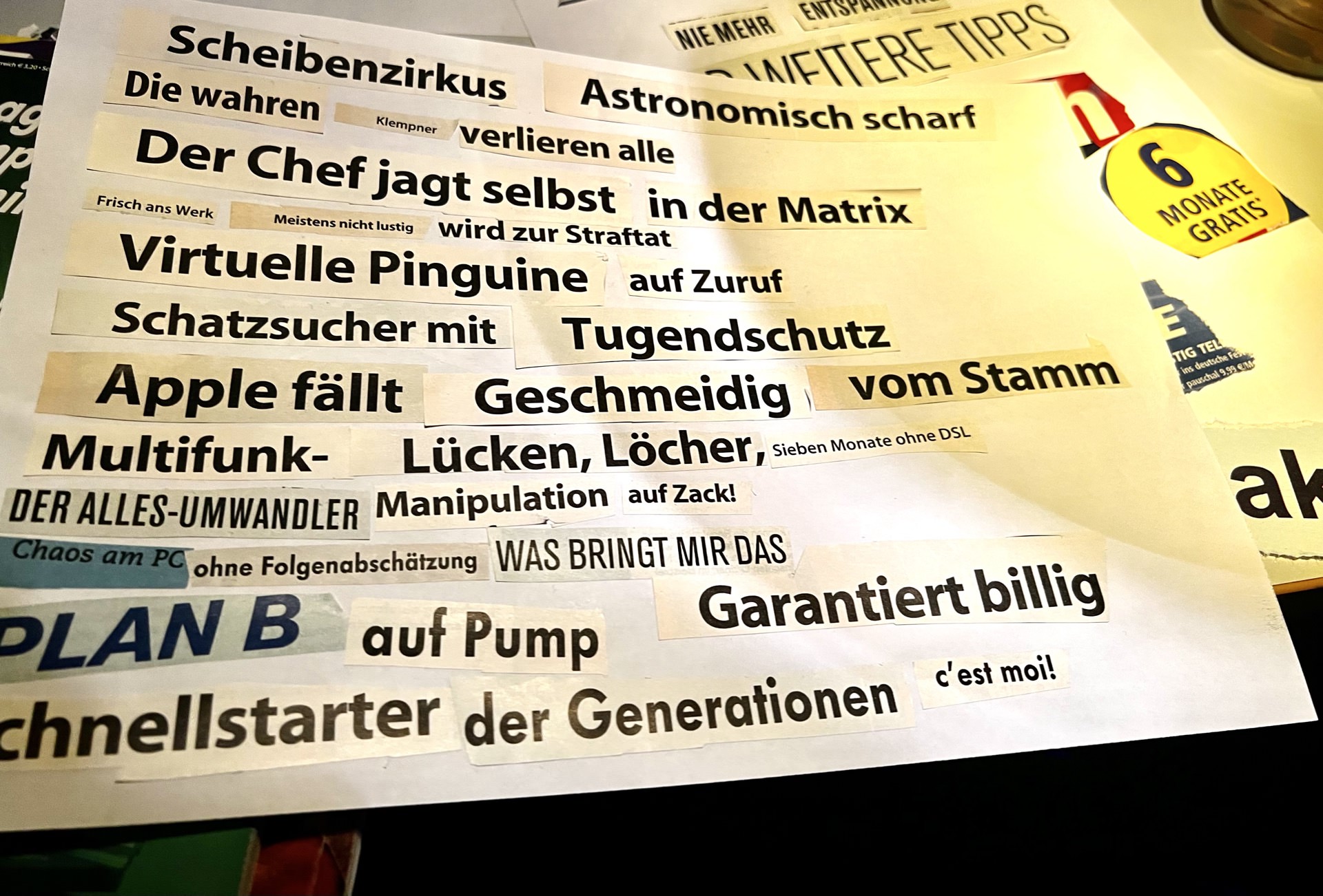 Aus alten und neueren Computerzeitschriften, Pressemitteilungen voller magischem Denken und beinahe schon poetischen CEO-Entschuldigungen bei Datenverlust konnten Personen eigene Gedichte zusammenkleben.